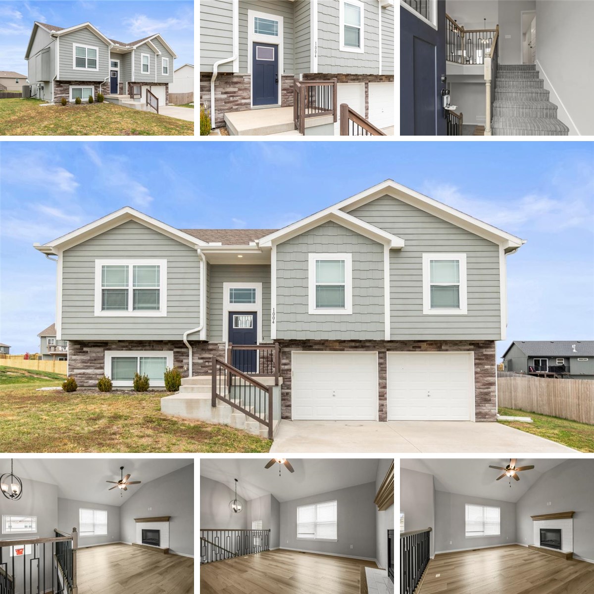 Prepare to fall in love with this almost-new construction, split-level home in the desirable North Creek community of Oak Grove! Designed with an inviting and calm aesthetic, this property perfectly blends modern features with cozy, livable spaces. It's ready for you to move in and start making memories! The architectural style creates a wonderful separation between living areas while maintaining an open, airy feel thanks to the vaulted ceilings and open-concept layout between the kitchen and living room. The gourmet kitchen is truly the heart of the home, featuring sparkling white cabinetry, a large center island with a crisp white quartz-style countertop, a full suite of stainless steel appliances, and a chic subway tile backsplash. The main living area is highlighted by a stunning, vaulted ceiling and a beautiful fireplace framed by white subway tile and a rustic wood mantle—perfect for gathering on chilly evenings. Your private primary suite is a luxurious retreat, featuring a tray ceiling and soft, neutral-toned carpet. The ensuite bathroom is a showstopper with a double-sink wood-toned vanity, contemporary light fixtures, and eye-catching patterned tile flooring. The attached walk-in closet offers smart organization with built-in shelving and ample hanging space. You'll appreciate the continuous, premium hard-surface flooring throughout the main floor living areas for easy maintenance and a cohesive look, complemented by sleek black hardware on cabinets and doors for a bold, contemporary contrast. The staircase, featuring modern black wrought iron balusters, connects the levels with style. The finished lower level provides excellent bonus space for a second family room, home office, or play area, complete with large windows for natural light. The exterior offers great curb appeal with charming gray-blue siding, white trim, a stone-accented front, and a two-car garage. This home is truly a special find—a perfect blend of style, comfort, and functionality.