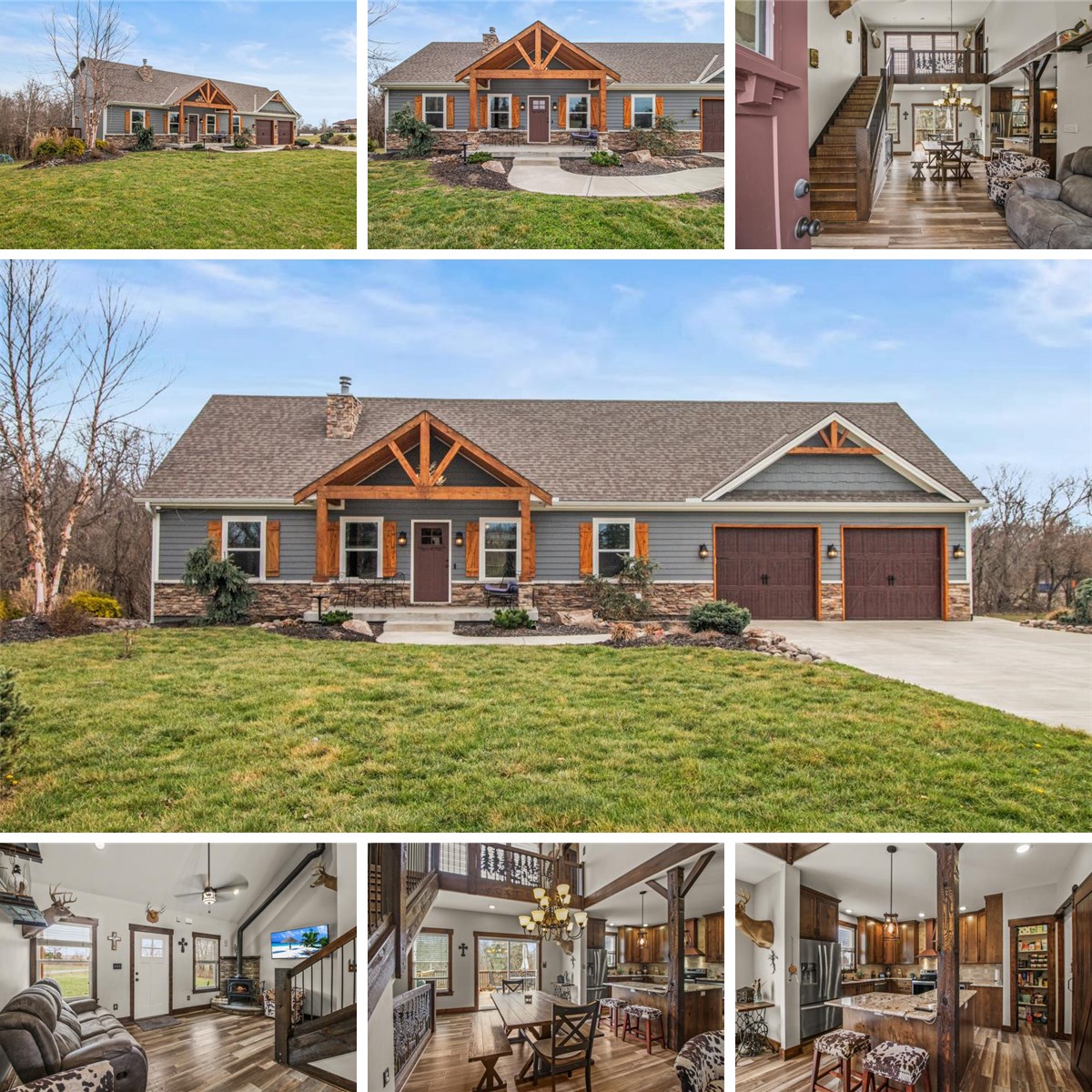 Escape to your own private retreat on 10 beautiful acres in Oak Grove, where this nearly new custom home is surrounded by mature trees, including black walnut, a creek, abundant wildlife, and established walking trails. Properties like this rarely come available in Oak Grove, offering privacy, space to roam, and a thoughtfully designed home just minutes from town. Inside, the home features vaulted ceilings, granite countertops, and a wood-burning stove set against a beautifully crafted stone fireplace wall, creating a warm focal point. A custom staircase with industrial-style rebar spindles and a barnwood-style railing adds character. The kitchen includes custom cabinetry, a copper sink, granite countertops, and a walk-in pantry. The main-level primary suite offers double vanities, a tiled shower with dual shower heads, and main-level laundry. A private deck just off the suite provides a quiet space to enjoy the surrounding nature. Upstairs are two additional bedrooms, each with their own bathroom features. The finished basement includes a bedroom, full bathroom, kitchenette, built-in surround sound with subwoofer, and space for entertaining or extended living. A reinforced concrete room offers the option of a storm shelter or secure storage. The heated and cooled basement garage includes a utility sink, hot and cold water hose bibs, and a built-in speaker system, ideal for washing vehicles or outdoor gear. Outside, enjoy the cedar front porch with antler chandeliers or the 12×24 deck, along with professional landscaping, driveway trees, and a long driveway with a concrete turnaround. The acreage offers woods, a stream, walking trails, and an elevated enclosed deer stand, perfect for outdoor enthusiasts or anyone seeking peaceful country living. Sqft is estimated. Buyer and buyer’s agent to verify.
