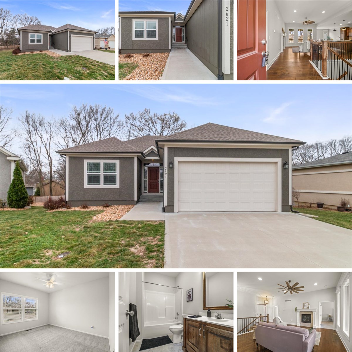 Welcome to your dream retreat in Blue Springs, where modern sophistication meets suburban tranquility. This stunning contemporary ranch immediately captivates with impeccable curb appeal, featuring a sleek exterior and an inviting front door. Step inside to an expansive open-concept great room, where soaring ceilings and a magnificent ten-blade farmhouse fan create an airy, upscale atmosphere. The living area, anchored by a cozy fireplace with a classic white mantel, flows seamlessly into a gourmet kitchen designed for the modern chef. You will love the rich custom cabinetry, gleaming granite countertops, and a sprawling center island—perfect for morning coffee or hosting vibrant gatherings. High-end stainless appliances and a spacious pantry ensure this kitchen is as functional as it is beautiful.