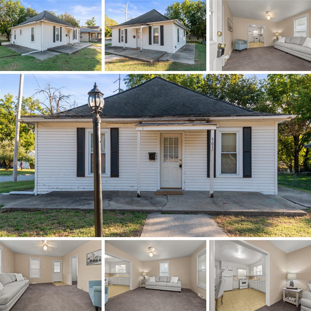Welcome to a charming and cozy bungalow nestled in the heart of Independence, MO! This delightful property is a fantastic find, whether you're looking for your first home or a smart investment to add to your portfolio. Step inside to a crisp and clean interior with a soothing, neutral color palette and plush carpet throughout the inviting living areas. The spacious kitchen is a true highlight, boasting a fresh, all-white aesthetic with abundant cabinets and counter space, offering a clean canvas for your culinary adventures and plenty of room for a dining area. The home features two comfortable bedrooms and a sweet, full bathroom with clean white tile and a modern vanity. Outside, you'll enjoy the private, fenced backyard and the flat, grassy area, which is perfect for outdoor activities, gardening, or relaxing on a sunny afternoon. With a prime location just minutes from the historic Independence Square, you'll have easy access to local dining, unique shops, and key historical sites, making this sweet home a wonderful chance to own a piece of Independence! Schedule your showing today.